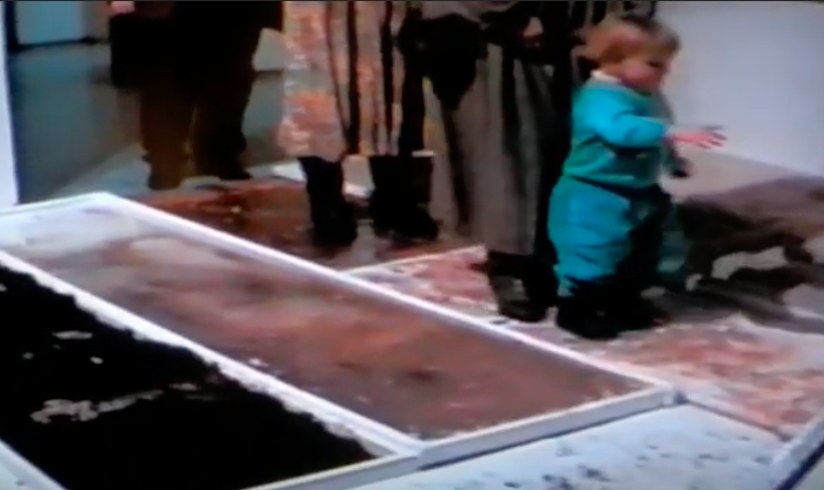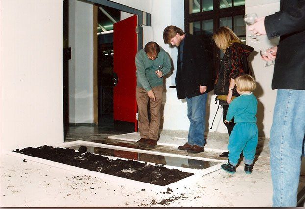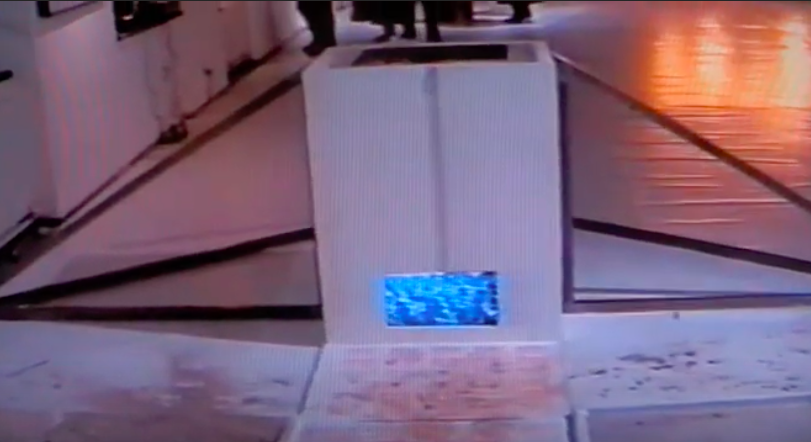Gegenüber dem Eingangs Boden-Mittelfeld steht ein Objekt. Ein TV Bildschirm in Bodennähe zeigt Ausschnitte aus der ORF Universum Dokumentation El Dorado. "Garimperos" Goldminenarbeiter in der Serra Pelada (siehe Bild weiter unten). Aus dem Objekt steigt (Hg) Nebel. Sieht man von Oben in das Objekt zeigt sich ein zweiter Bildschirm.