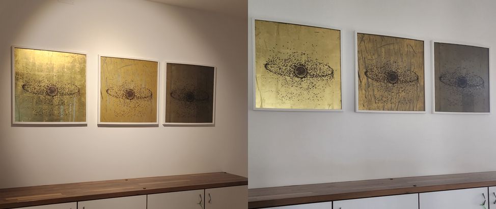Zeigt sich am Anfang eine sensible Goldfläche mit Schuhabdrücken als goldener Spiegel wird mit der Zeit das Bodengold visuell „flacher und stumpfer“.