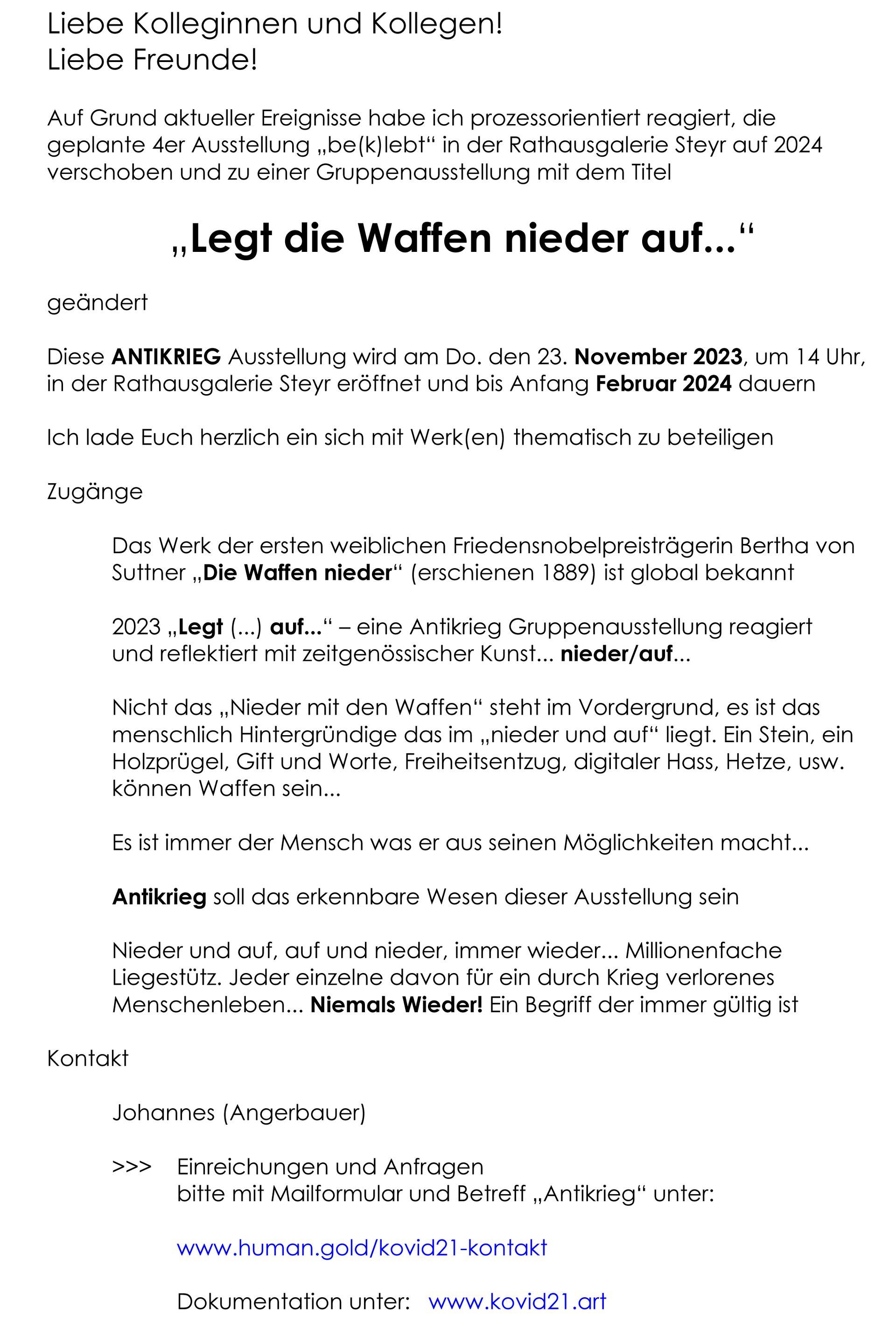 Am 3.2.2023 traf ich die Entscheidung, nach Absprache mit drei Künstlerkollegen, die November Ausstellung "be(k)lebt" um ein Jahr zu verschieben und den November Termin mit einer Antikrieg Gruppenausstellung "Legt die Waffen nieder auf..." zu bedienen