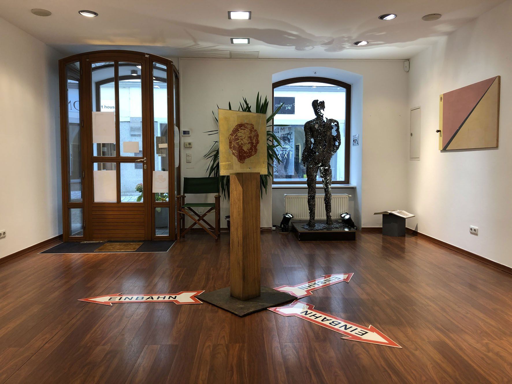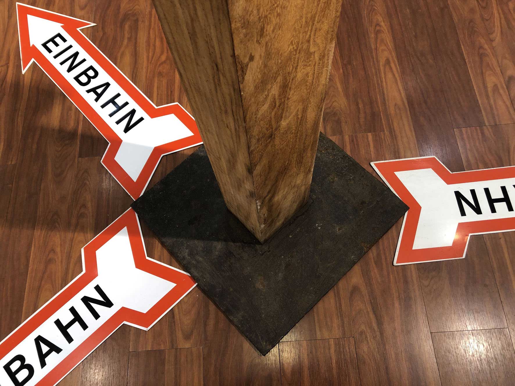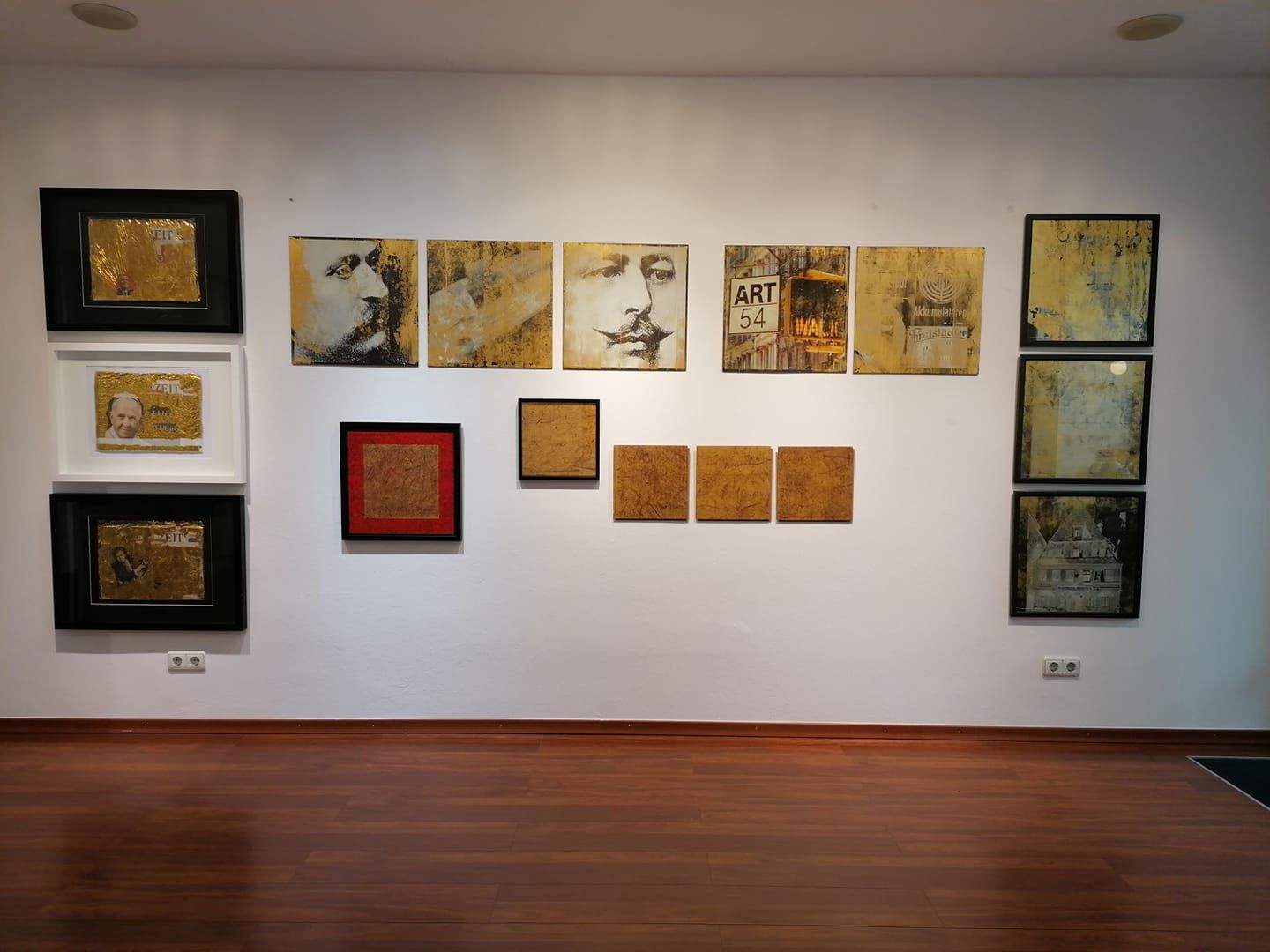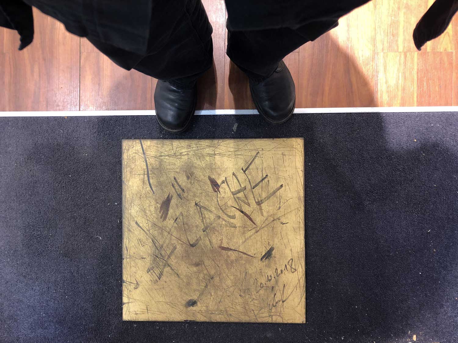 Die Bodengold Eingangsschwelle zur Ausstellung "Fläche" im Kunsthandel Pohlhammer (Okt. 2018) wurde nach einem Jahr aufgerichtet und in das Zentrum der Rauminstallation plaziert. Goldene Spuren eines Kunsthandel Jahres (Das Werk ist in Privatbesitz). Eine zweite Bodengold Eingangsschwelle wurde installiert die von 5.10.2019 bis zum Ende der Kunsthandel Tätigkeit von Frau Frieda Pohlhammer im März 2021 als goldene Spurensicherung diente.