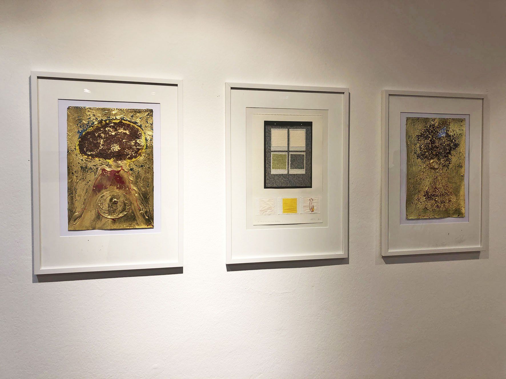 Drei Arbeiten aus der Reihe "Goldminen Arbeiten auf Papier" an der gegenüber liegenden Wand.