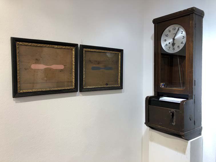 Neben den offenen Zeitrahmen der Zeitnehmer aus der Künstlerhaus Rauminstallation und die zwei Zeitschlitz Poliment Relikte. Neben der Stechuhr, am Boden, ein Buch zum Werk von Yves Klein... Die Seite mit seiner Aktion vor der Notre Dame aufgeschlagen