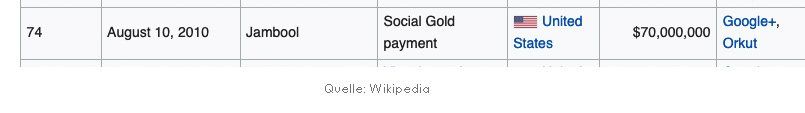 Angebot von Jambool für die TLD socialgold.com über 50.000 USD im Mai. Umgehend abgelehnt. Am 10. August 2010 kaufte Google "Jambool" und "Social Gold" um 70 Mio USD